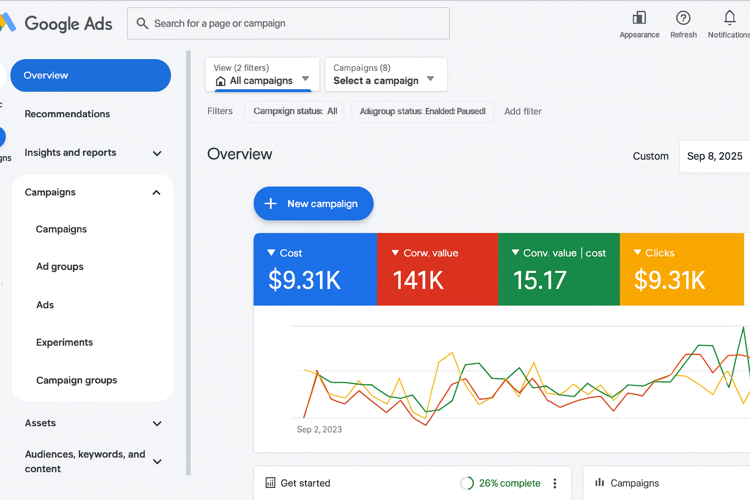 Configuración y lanzamiento de campañas Google Ads Creamos anuncios para Red de Búsqueda, Display, YouTube y Remarketing.